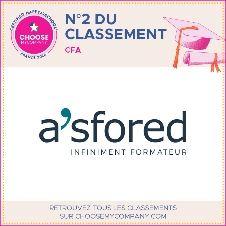 ![]() | 2022 : l’Asfored - CFA de l’Édition s’est hissé à la 2ème place du classement HappyIndex®AtSchool des écoles CFA. |